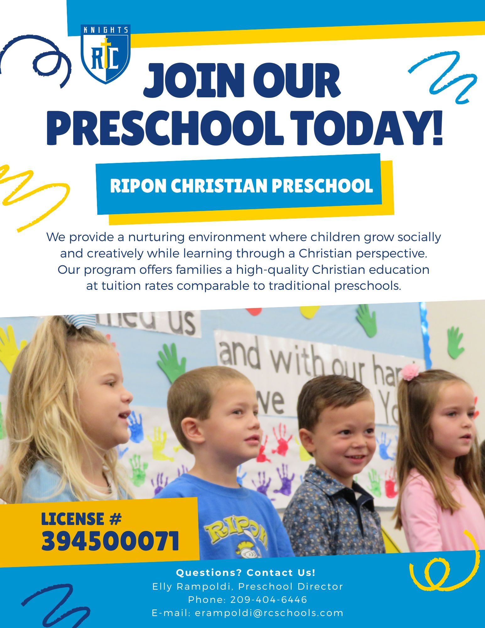 Ripon Christian Preschool is state-approved and developmentally appropriate. Ripon Christian’s goal is to educate and guide preschool students while building foundational language, handwriting, and mathematical skills in an environment rich in social development, and most of all, God’s Word. Nurtured in a safe and loving environment, children learn to explore their gifts and abilities through a wide variety of activities. Play centers are intentionally designed to support young learners as they progress to the next developmental stage.